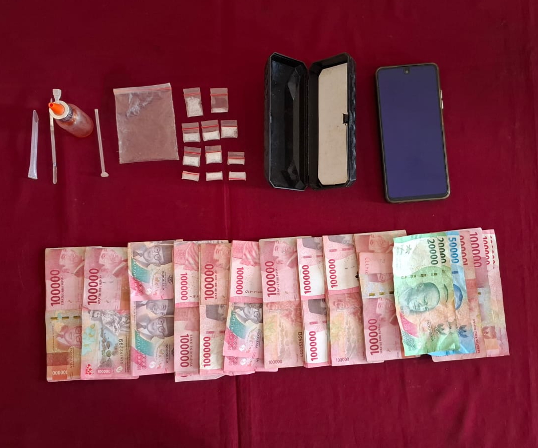 Barang Bukti yang Diamankan: ✅ 11 paket kecil berisi sabu dengan berat bruto 3,64 gram ✅ 1 plastik klip bening ukuran sedang kosong ✅ 2 sendok sabu dari pipet sedot ✅ 1 alat hisap bong dari botol plastik ✅ 1 wadah kacamata hitam merk Optical ✅ Uang tunai sebesar Rp10.490.000 ✅ 1 unit handphone Oppo A3X berwarna biru.