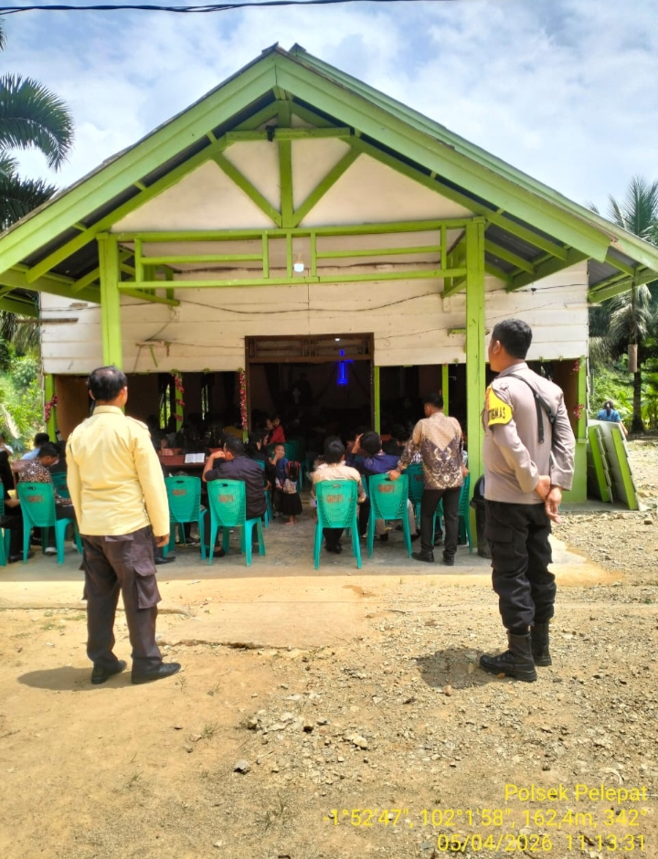 BUNGO – Personel Polsek Pelepat melaksanakan pengamanan kegiatan ibadah dalam rangka peringatan wafat Isa Almasih (Jumat Agung) sekaligus perayaan Paskah Tahun 2026 yang berlangsung di Gereja Kristen Protestan Indonesia (GKPI) PT PML Sei Sekapas, Belukar Panjang, Dusun Batu Kerbau, Kecamatan Pelepat, Minggu (5/4/2026) pukul 11.00 WIB hingga selesai.