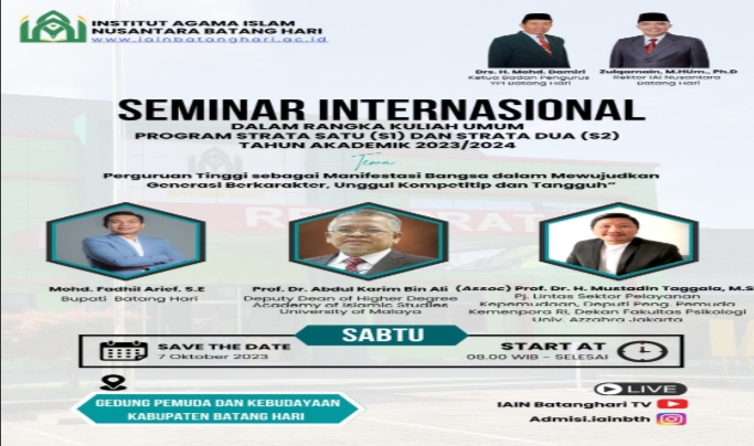Sigap91news.com | Batang Hari – Institut Agama Islam (IAI) Nusantara Batang Hari menggelar acara Seminar Internasional Bertempat di Gedung Pemuda Muara Bulian. Sabtu, (07/10/2023).
