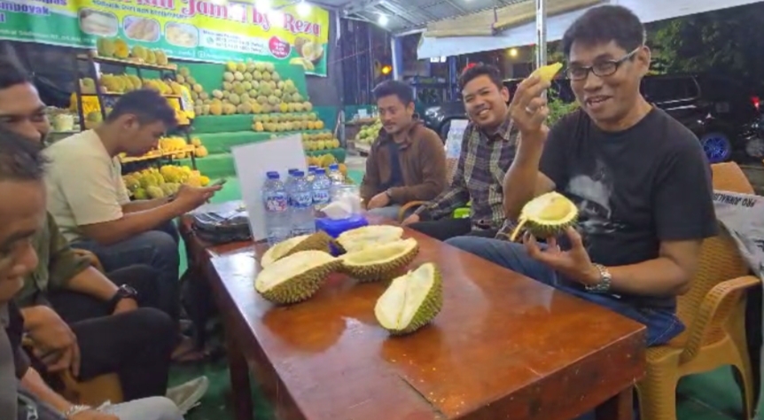 Durian yang terkenal dengan rasa legit dan teksturnya yang lembut pun menjadi sorotan utama saat Mahmud Marhaba bersama Ketua DPD PJS Provinsi Jambi, Wahyu Jati, dan para anggota lainnya menikmati hidangan tersebut. Dalam momen santai, penuh canda tawa, Mahmud mengungkapkan kekagumannya terhadap durian lokal.