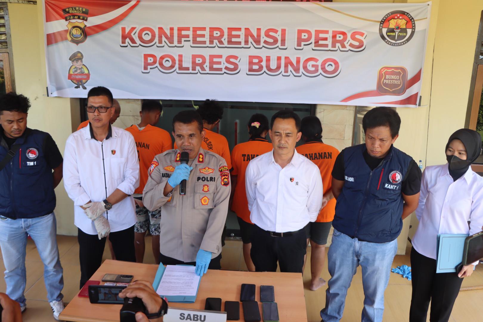 “Untuk ke Lima tersangka ini secara komulatif bisa kami golongkan sebagai Bandar Sabu di Wilayah Kabupaten Bungo,” Ujar AKBP Natalena Eko Cahyono.