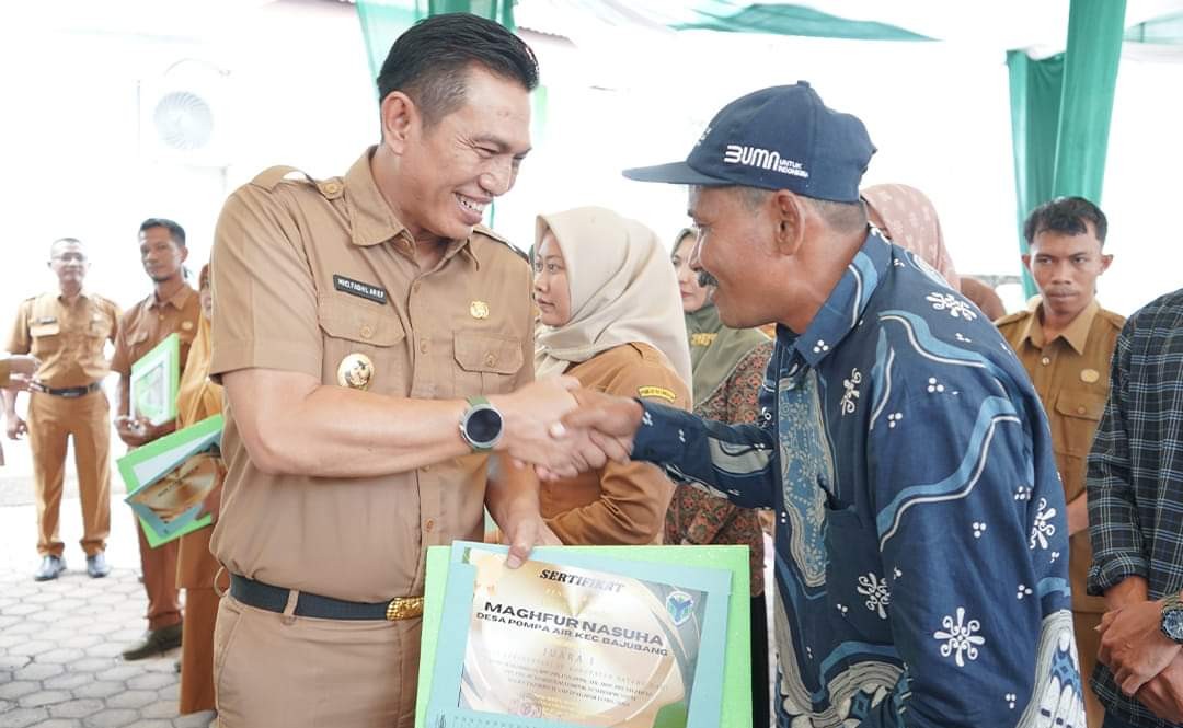 Bupati Batang Hari Mhd. Fadhil Arief Acara Penyerahan Alat Mesin Pertanian dan Hadiah Lomba Serta Penghargaan Kelembagaan Petani Dalam Rangka Mendukung Super Tangguh Kabupaten Batang Hari Tahun 2024. Bertempat di halaman kantor Dinas Pangan, Pertanian dan Perikanan Kabupaten Batang Hari, Senin (10/06/24).