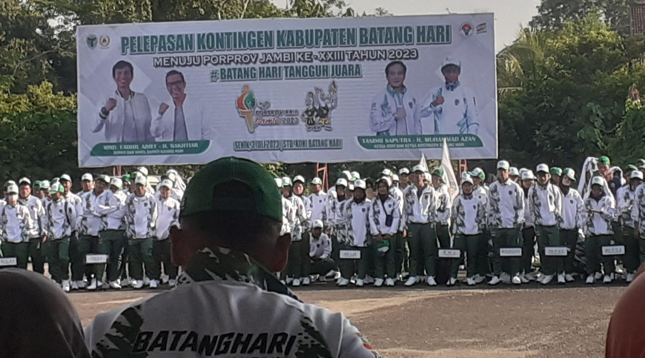 Sigap91news.com|Batang Hari–Pemerintah Kabupaten Batang Hari pada ajang Porprov Jambi ke XXIII Tahun 2023,melalui Komite Olahraga Kabupaten Batang Hari melepas para kontingen Kabupaten Batang Hari di halaman stadion gedung KONI Muara Bulian,senin(03/07/2023).