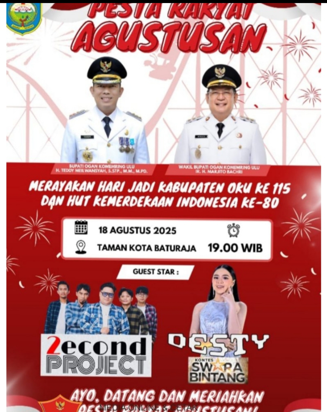 Pemerintah Kabupaten OKU mengajak seluruh masyarakat untuk hadir, berpartisipasi, dan merasakan kemeriahan malam perayaan ini sebagai wujud rasa syukur atas perjalanan panjang Kabupaten OKU serta kemerdekaan bangsa Indonesia.