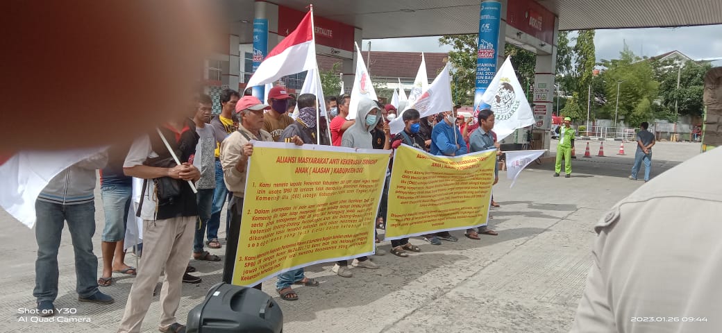 Adapun tuntutan dari ALASAN yang di bacakan kordinator lapangan dua, Leo Nardo, yang pertama. Kami meminta kepada Pemerintah Kabupaten OKU agar dapat segera mencabut izin usaha SPBU UB lantaran tidak mendukung Pemerintah Kabupaten Ogan Komering Ulu (OKU) sebagai Kabupaten layak anak Tingkat Pratama Kedua. Dalam kesempatan ini pula kami meminta kepada pihak Kepolisian Resor Ogan Komering Ulu agar tetap memproses hukum terhadap terduga pelaku penyekapan serta pihak manajemen SPBU UB yang ikut bertanggung jawab sesuai dengan ketentuan Undang-Undang Perlindungan Anak dan Undang -undang lainnya, dikarenakan kasus tersebut bukanlah delik aduan melainkan delik biasa sebagaimana yang telah diatur dalam ketentuan KUHP, serta yang Ketiga.Meminta Kepada Pertamina Regional Sumatera Bagian Selatan untuk dapat menutup SPBU UB dengan Nomor No.24.321.112 Karna telah lalai melakukan tanggung jawab lingkungan serta lalai membina Karyawannya yang menyebabkan Kekerasan terhadap anak.