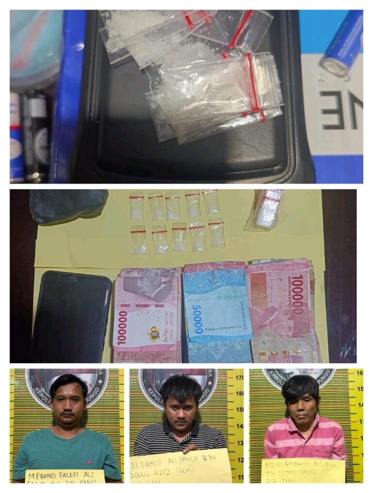 ” Benar, ketiga pelaku sudah diamankan oleh Satresnarkoba Polres Bungo. Penangkapan ini hasil pengembangan dari informasi masyarakat dan pengintaian yang kami lakukan. Salah satu pelaku sempat membuang barang bukti ke tanah sebelum akhirnya ditemukan oleh petugas,” Jelas AKP M. Nur.